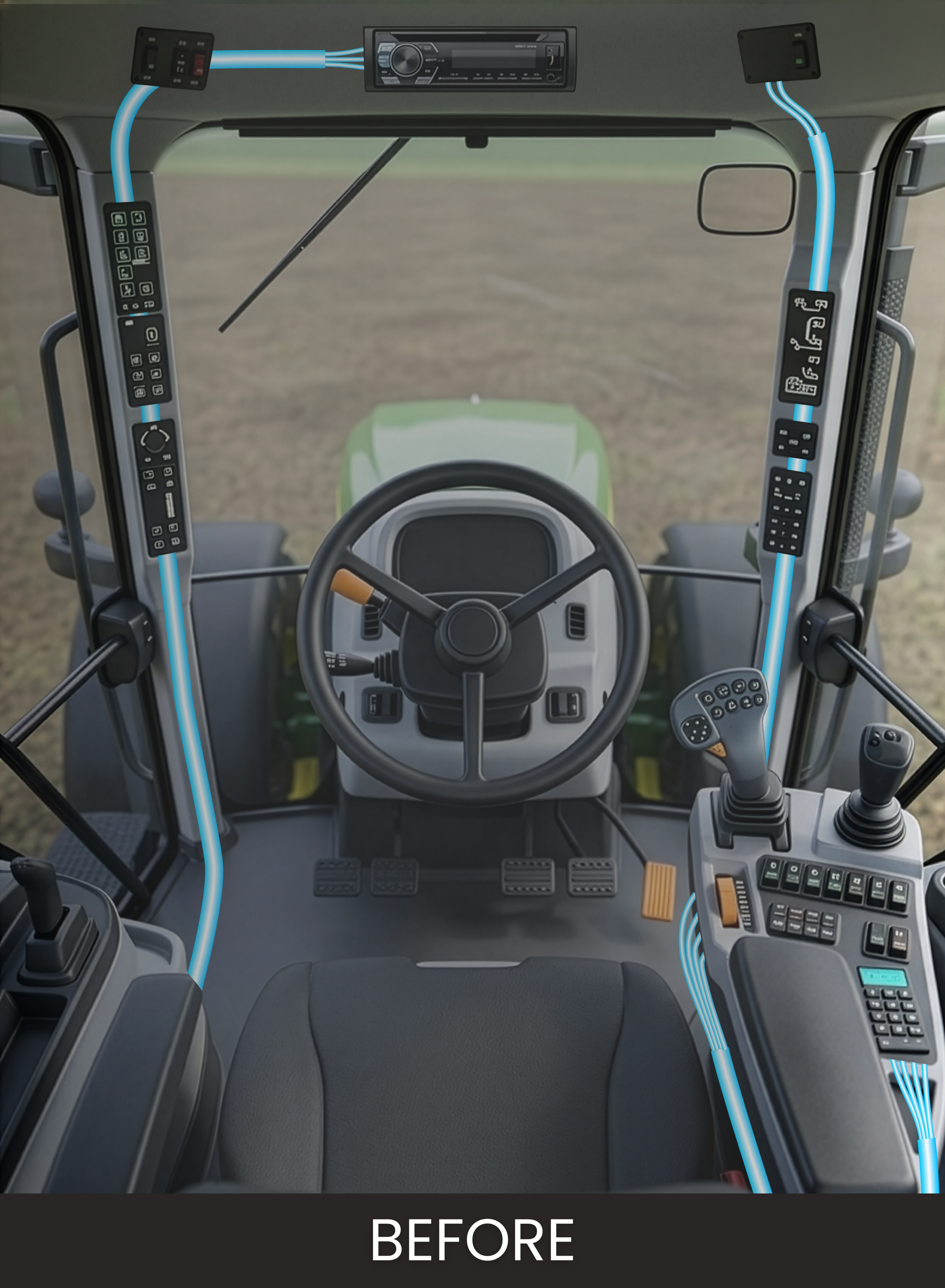 The keypad consolidates complex control panels into a single unit that is so compact it can be integrated, for example, into the A-pillar of a tractor or wheel housing. This reduces the amount of wiring required and, consequently, engineering, installation, and manufacturing costs. Not to mention the clearer layout of the cab and the safety-enhancing concentration of all control elements.