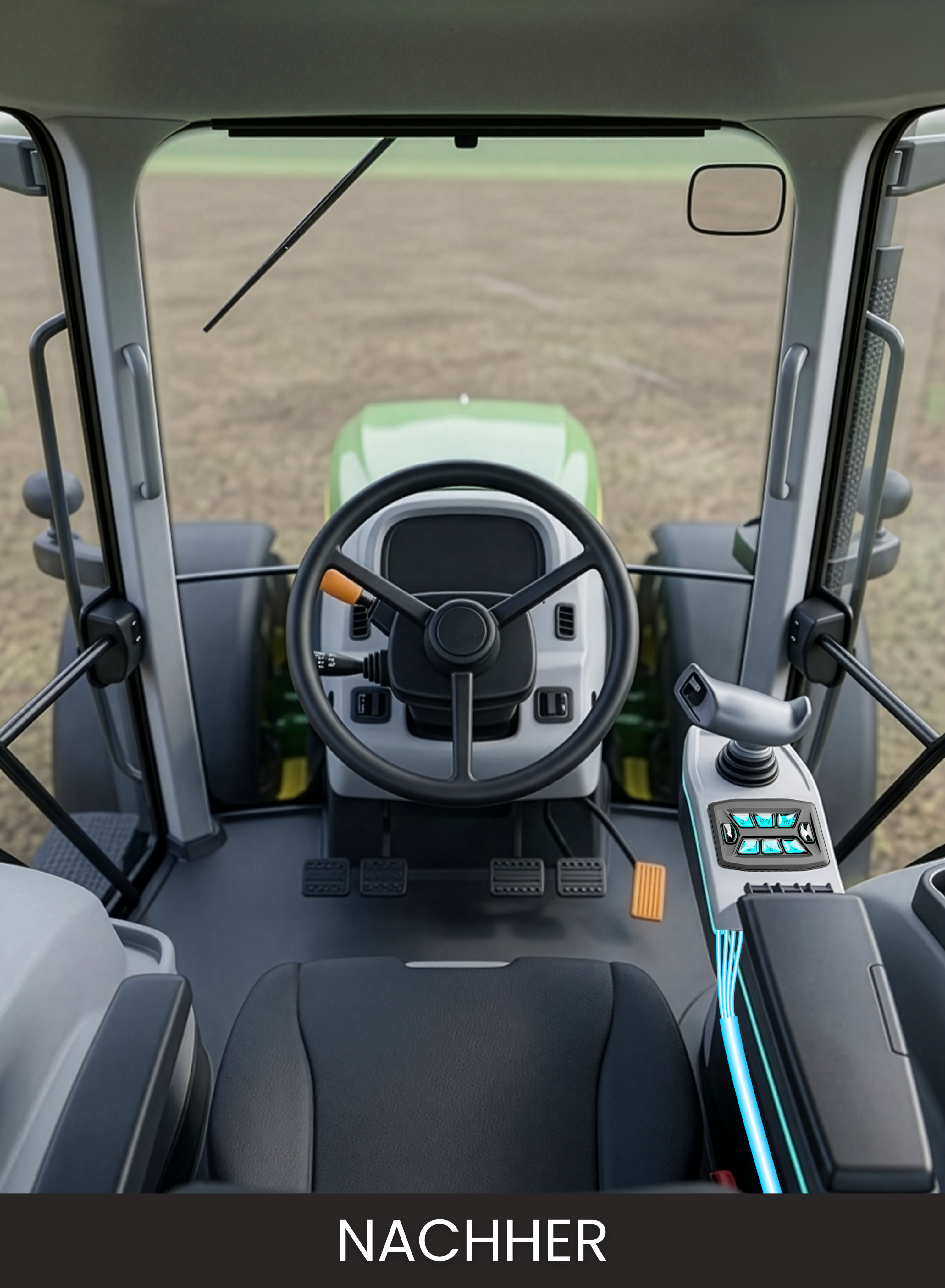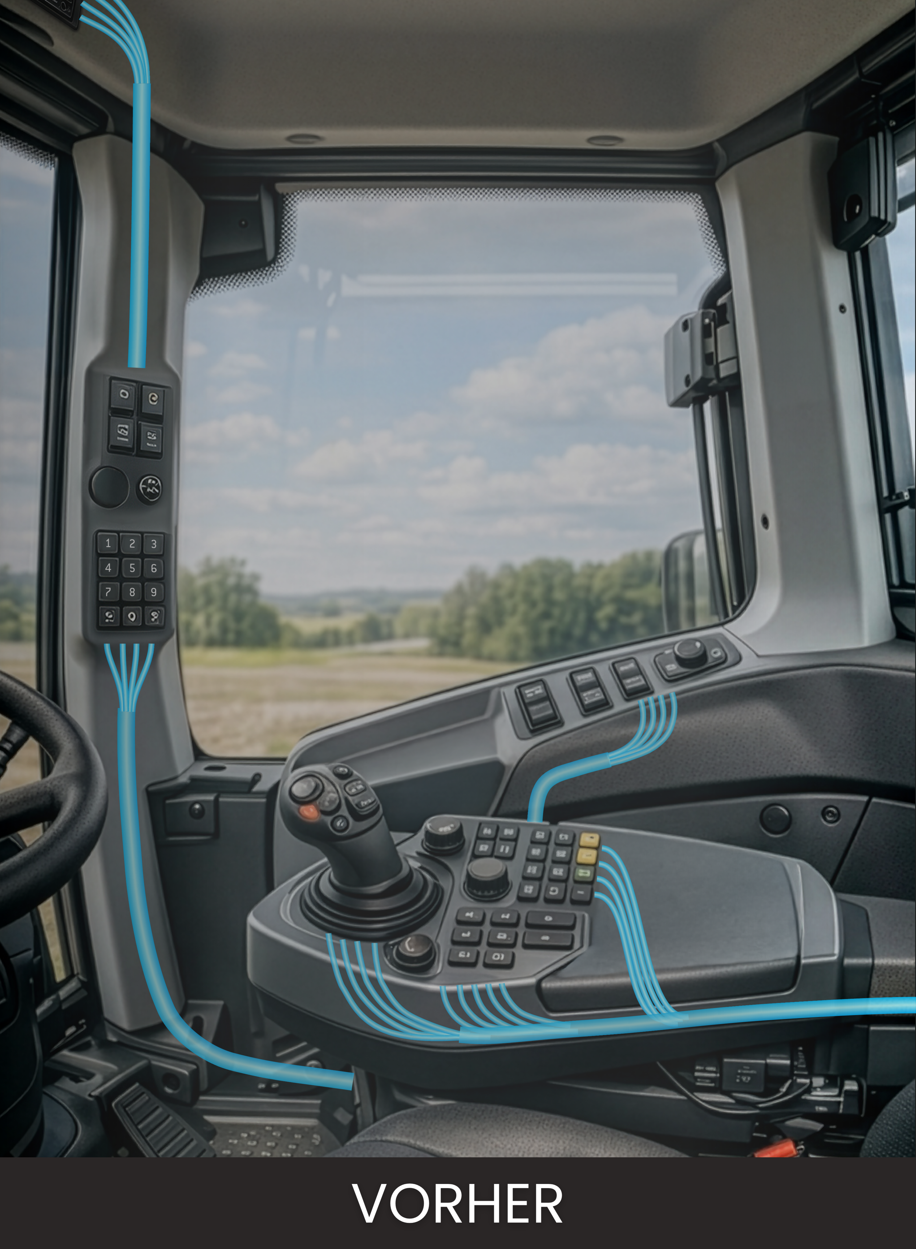Funktionen können je nach Einsatz individuell belegt und schnell angepasst werden. Die kompakte Bauweise erleichtert die Integration in enge Kabinenbereiche. Gleichzeitig sorgt die robuste und wetterfeste Ausführung für zuverlässigen Betrieb unter allen landwirtschaftlichen Bedingungen.